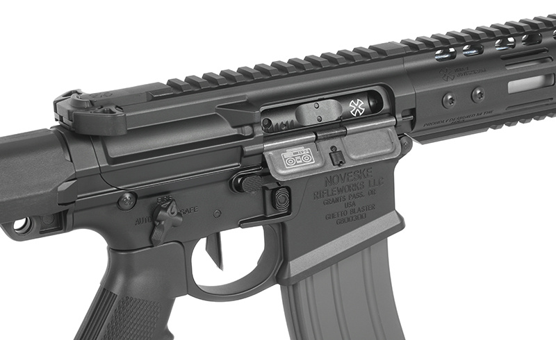 The Noveske N4 Ghetto Blaster MWS features a robust metal upper and lower receiver, giving it a sleek and authentic look, further enhanced by deeply engraved Noveske trademarks. The 7,94-inch outer barrel perfectly complements the rifle's aesthetics and is paired with an NHR-7" aluminum rail handguard compatible with both M-LOK and Picatinny systems. This handguard not only enhances the replica's streamlined appearance but also provides convenient mounting points for various accessories.