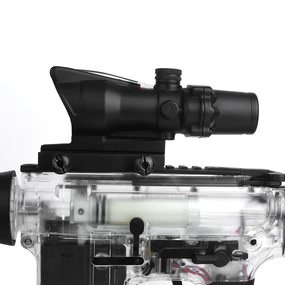 This ACOG 4x32 Illumination Source Fiber Black red dot from Aim-O offers an optical aiming device with a magnification of four times. The objective lens of 32 mm provides a large light input, resulting in a clear image.