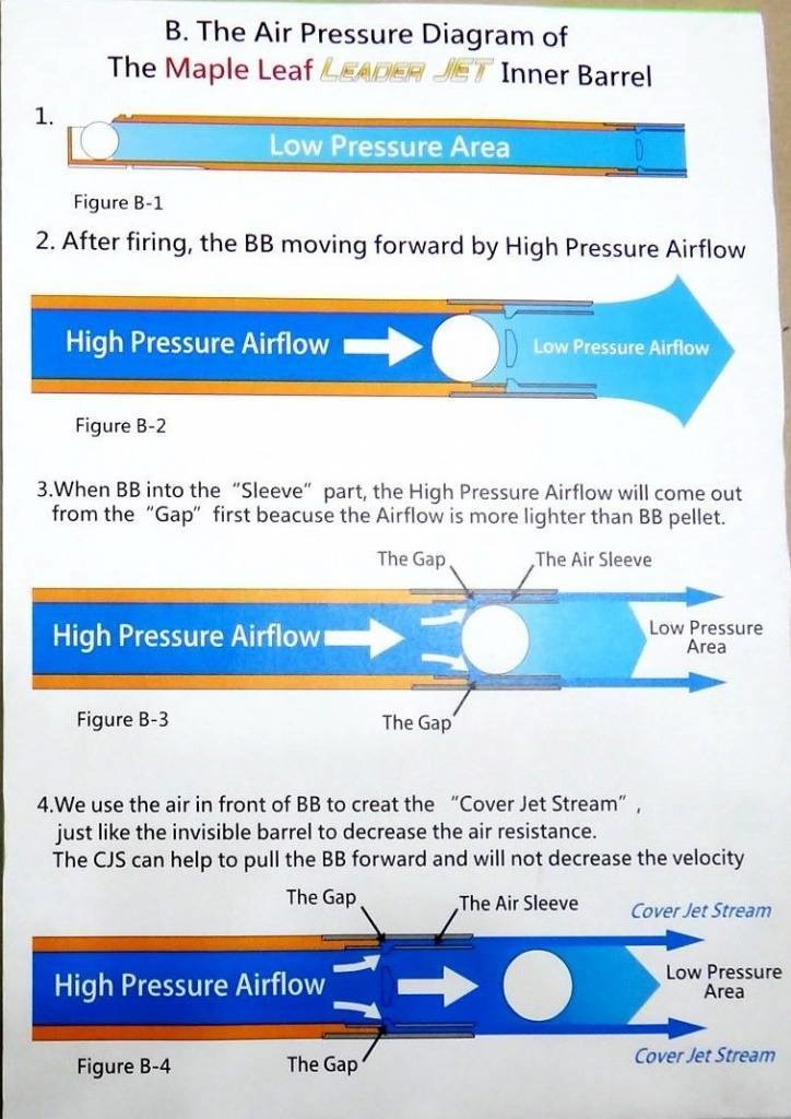 Maple Leaf diseñó un cañón donde el extremo es más ancho en comparación con el resto del cañón. Al final del cañón, el aire pasará por la BB y saldrá primero y cuando la BB sale del cañón, la corriente de aire tira de la BB en lo que se llama una corriente en chorro. ¡Esto tendrá menos resistencia en el BB y NO disminuirá la velocidad sino que aumentará la precisión en su lugar!