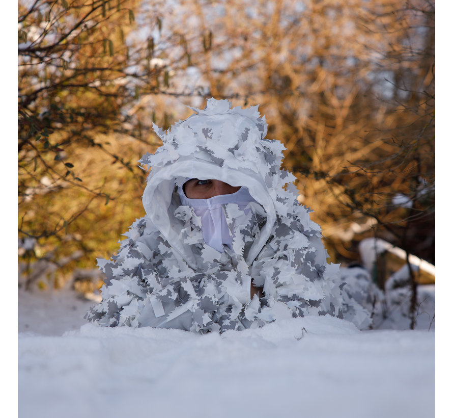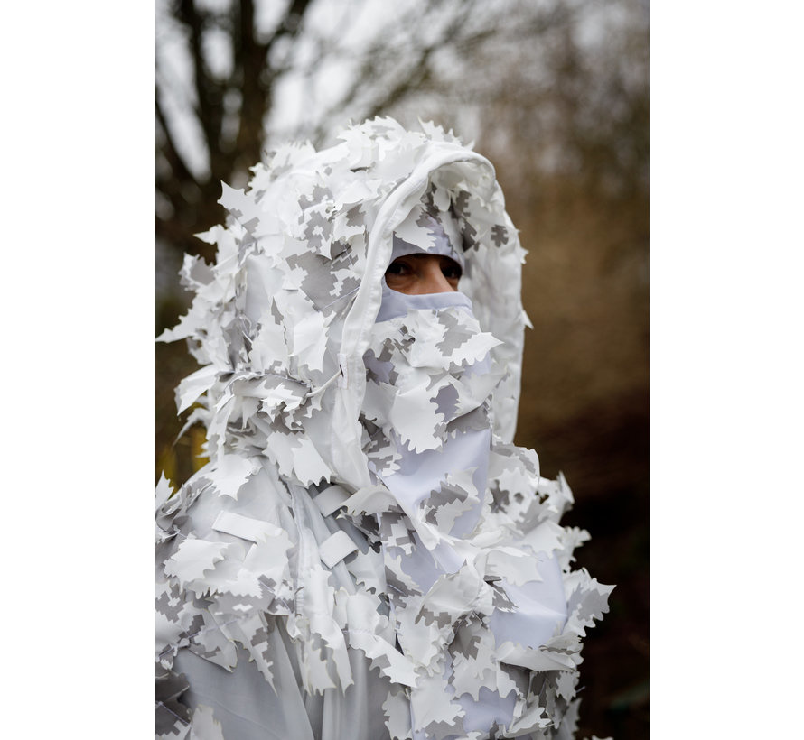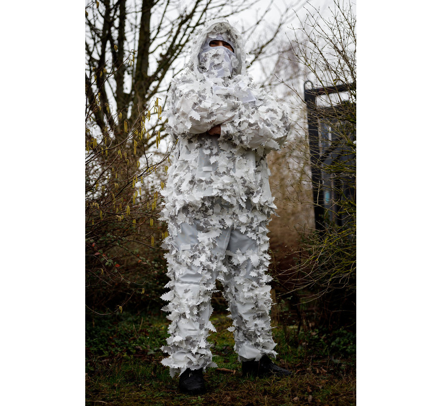 Traje de Stalker Ghillie / Leaf en combinación de colores 'Winter'. ¡Este traje funciona perfectamente para los juegos de invierno, este traje crea un efecto 3D para cubrir tu silueta con el patrón 3D!